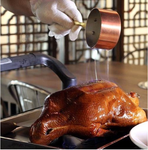經過柴火淬鍊的烤鴨,再淋上君杜橙酒增添水果與酒的風味,火焰之舞結束後,旋即上演片鴨秀,將烤成琥珀色的鴨皮帶點薄肉片下,皮酥且油而不膩,肉吃得到13香淡雅的香氣,也吃得到櫻桃鴨特有的馥郁肉香。單吃片皮鴨是一種風味,用荷葉餅皮包小黃瓜、泡菜、蔥段與特製的甜麵醬又是另一種風味。