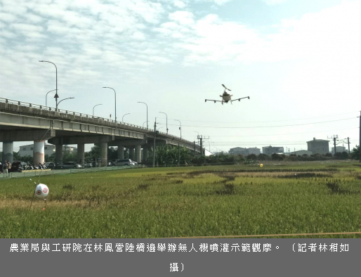 農業局主秘吳威達說,農業季節性缺工已成為常態,農委會為扭轉過去消極補貼舊思維,推行建立農業新典範、建構農業安全體系、提升農業行銷能力等新農業三大主軸。這次邀請廠商示範無人機,希望鼓勵專業農民透過大面積智能化無人機噴灑,降低環境汙染、改善生產效率及人力投入,做為國內推動新農業政策的參考指標。