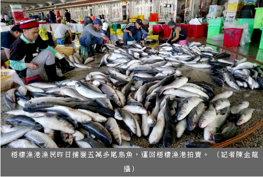 台中港外海昨日續有二十四艘漁船捕獲五萬零三百三十六尾烏魚,並運回梧棲漁港拍賣,其中蘇澳籍全吉慶八十八號漁船捕獲八千多尾,拔得頭籌,金協漁二十號捕獲五千六百八十七尾,鴻漁一號捕獲五千五百尾,其餘捕獲三千七百尾至數百尾不等,每尾拍賣價不分公母三百元,共獲利一千五百多萬元。