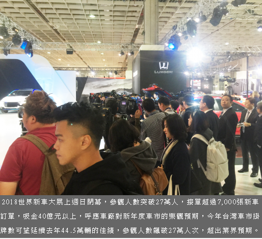 台灣甫落幕的「2018世界新車大展」,這每年年底台灣的重頭戲,間接表現著台灣經濟消費能力的指標。也因為如此,年底的台北車展更被台灣車商視為當年車市的重要風向球,無非都盡其所能提前曝光自家重量級新車或改款車。近來台灣汽車政策緊跟國際潮流腳步,預計2022要實施超嚴格的整廠平均油耗規範、2040年將全面禁售汽柴油車,國內車商為了因應變局與新時代的來臨,無不加速引進及開發電動車、插電式油電車等新能源車、以及未來概念車型,並且透過台北車展曝光試水溫。讓每年年底台灣雖還不到農曆年節卻熱鬧非凡。