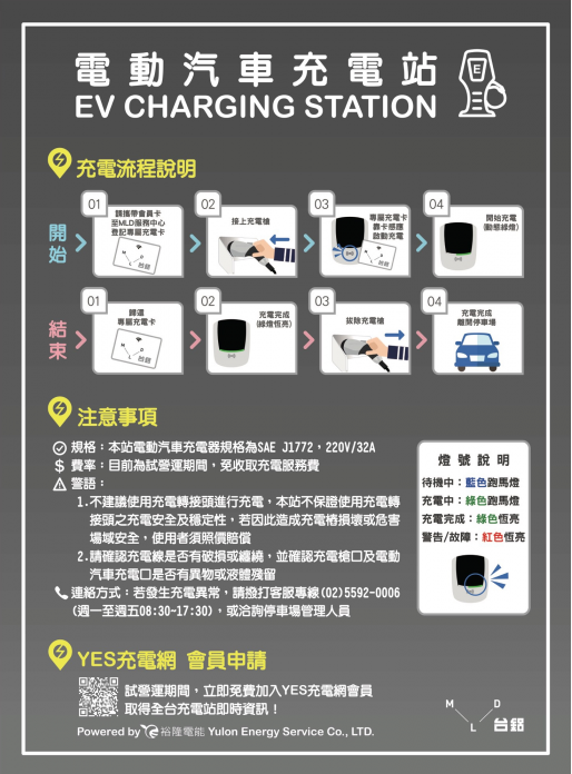 隨著各國針對空汙問題訂出禁售傳統燃油車政策陸續成形,台灣將在2040年汽車進入全電動車時代,裕隆集團旗下裕隆電能公司,持續推動電動車充電基礎建設布建,以及電動車周邊設施與配套方案。鑒於南台灣公共場域尚缺乏充電站布建,裕隆電能與高雄「都會生活開發公司」攜手,在MLD台鋁商場設置開放式電動車充電站,消費者即起可至商場櫃台申辦台鋁會員並索取充電卡,即享有充電服務。這座充電站是高雄首座設立於公共場域的電動車充電站,可提供BMW、Tesla、Nissan及Luxgen等電動車充電,為南臺灣開放場域充電站增加布點網絡。
