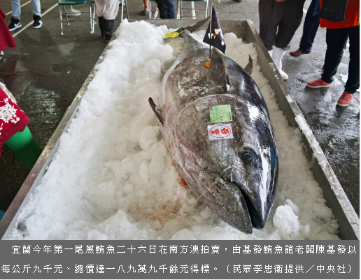 鮪魚季正式展開了,宜蘭第一鮪拍賣會昨日在蘇澳第三漁貨拍賣場熱鬧登場,蘇澳籍「日福二十六號」漁船捕獲的第一鮪重達二百一十一公斤,由宜蘭縣代理縣長陳金德主持,拍得每公九千元,總價近二百萬元,創下歷史新高紀錄。