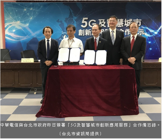 台北市政府為促進智慧城市創新應用服務發展,加速5G及物聯網成長茁壯,二日由資訊局漲李維斌、中華電信陳明仕總經理代表簽署「5G及智慧城市創新應用服務」合作備忘錄,未來合作方向包含行動通信網路整合智慧路燈相關應用之概念驗證、智慧城市創新應用展示體驗及場域驗證,及5G創新應用展示體驗及場域驗證。