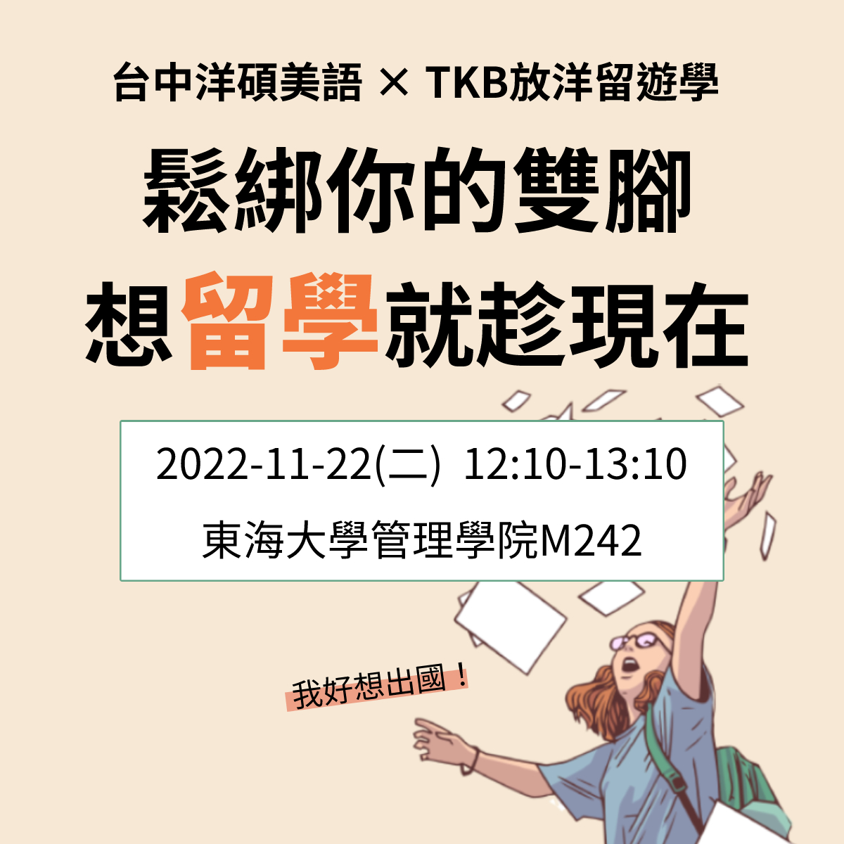 東海大學管理學院全體同學注意啦!解放你那蠢蠢欲動的心~出國留遊學不能再等!!! 近期實在是有太多同學來問留遊學資訊,於是!所有你想知道的,我們通通說給你聽!跟著【台中洋碩×TKB放洋留遊學】一一解惑!