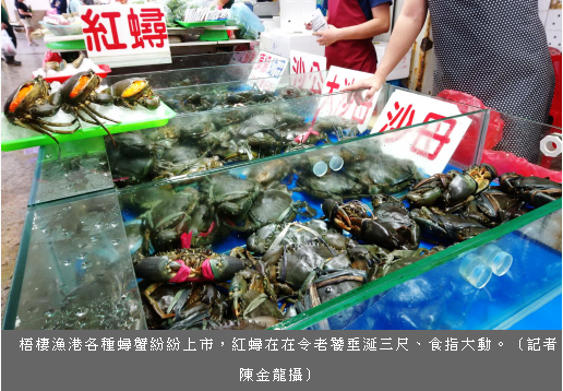 秋令時節,又是品嘗蟹類的好時機,梧棲漁港漁貨直銷中心攤位上擺滿三點蟹、花蟹、紅蟳等各式各樣的秋蟹及大閘蟹,令老饕垂涎三尺、食指大動,民眾想要嘗鮮,就趁現在,絕對讓民眾能吃個過癮。